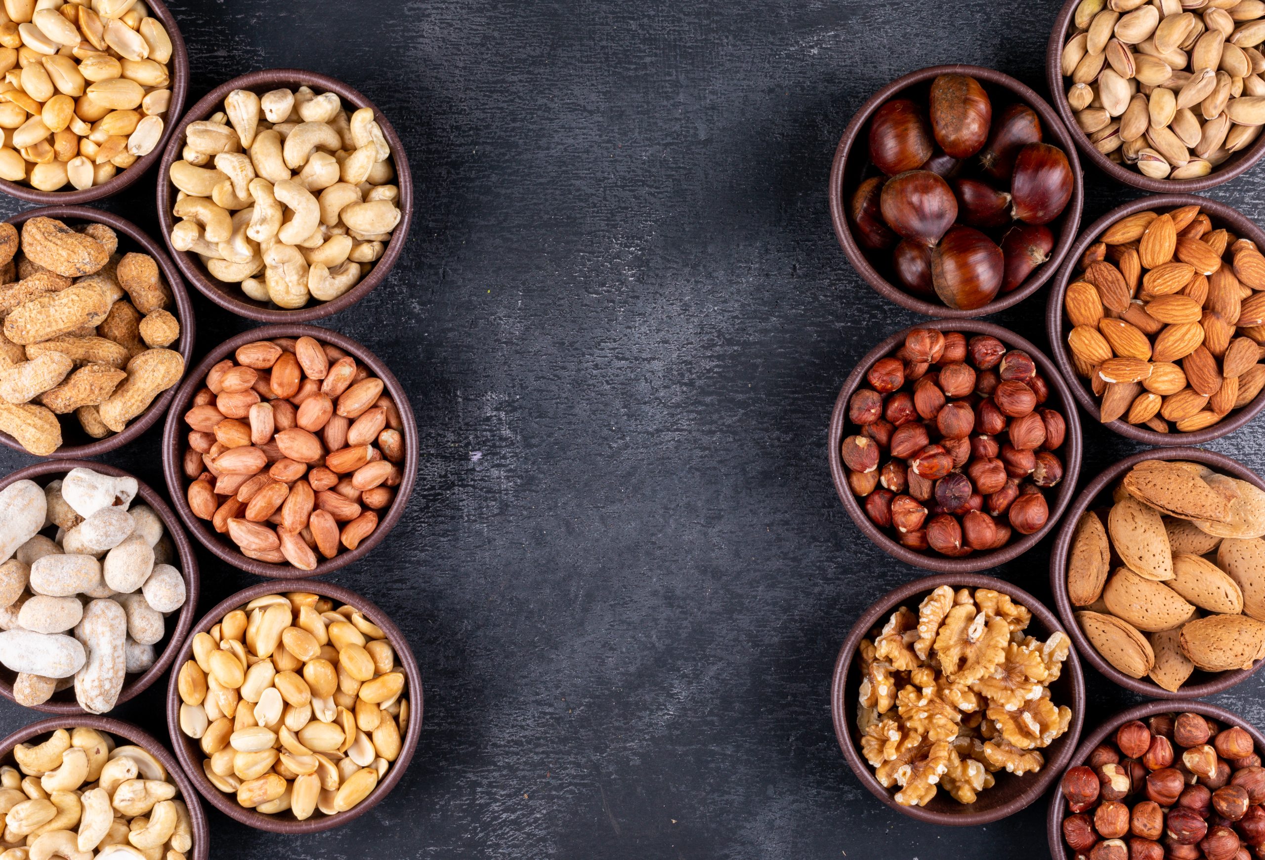 Flat lay assorted nuts and dried fruits in mini different bowls with pecan, pistachios, almond, peanut, on black stone background. horizontal free space for your text ۰۶ آبان