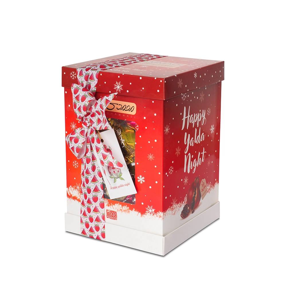 محتویات داخل جعبه شامل پشمک دو سر پیچ شکلات و هندوانه و شکلات سفید میباشد.